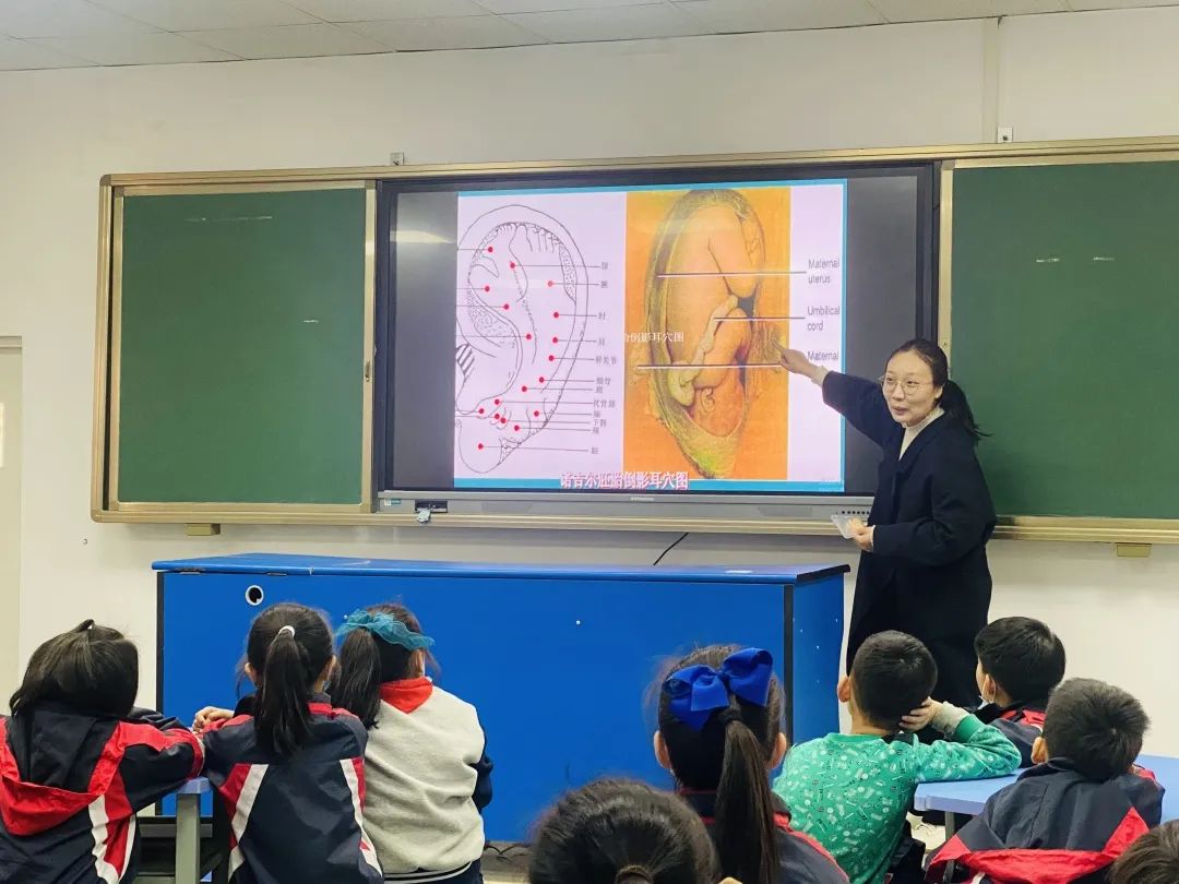 在江苏师范大学附属中学小学部,中医院康复医学科主管治疗师朱丹丹为孩子们生动形象地讲解了“耳朵里的秘密”——神奇的耳穴疗法。孩子们听得格外认真,积极举手发言,并跟着老师的讲解和同学们互相观察耳朵,学习中医知识。