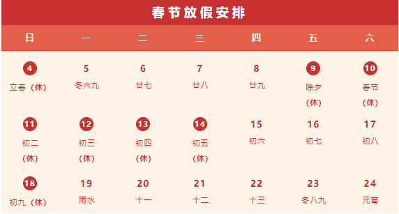 2月4日、2 月9日至2月14日、 2月18日放假。