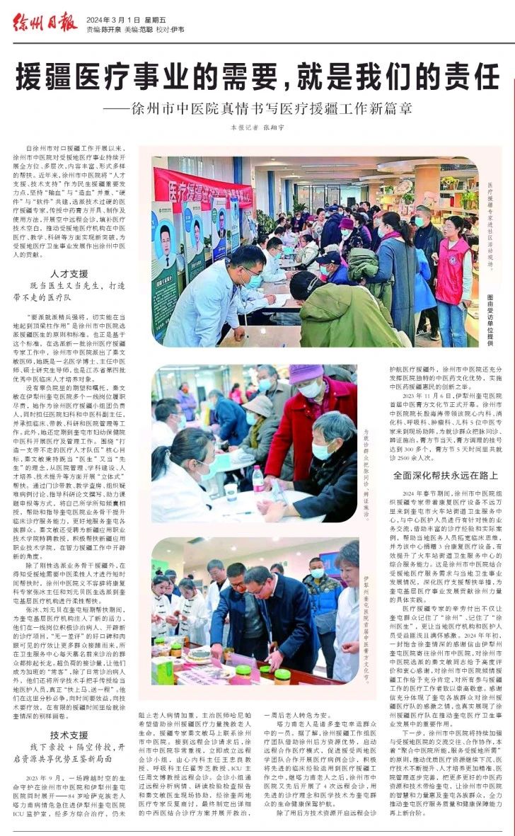 自徐州市对口援疆工作开展以来,优米app下载ios对受援地医疗事业持续开展全方位、多层次、内容丰富、形式多样的帮扶。近年来,徐州中医院将“人才支援、技术支持”作为民生援疆重要发力点,坚持“输血”与“造血”并重、“硬件”与“软件”共建,选派技术过硬的医疗援疆专家,传授中药膏方开具、制作及使用方法,开展空中远程会诊,填补医疗技术空白,推动受援地医疗机构在中医医疗、教学、科研等方面实现新突破,为受援地医疗卫生事业发展作出徐州中医人的贡献。
