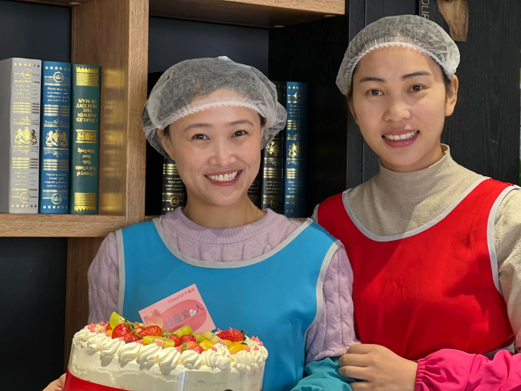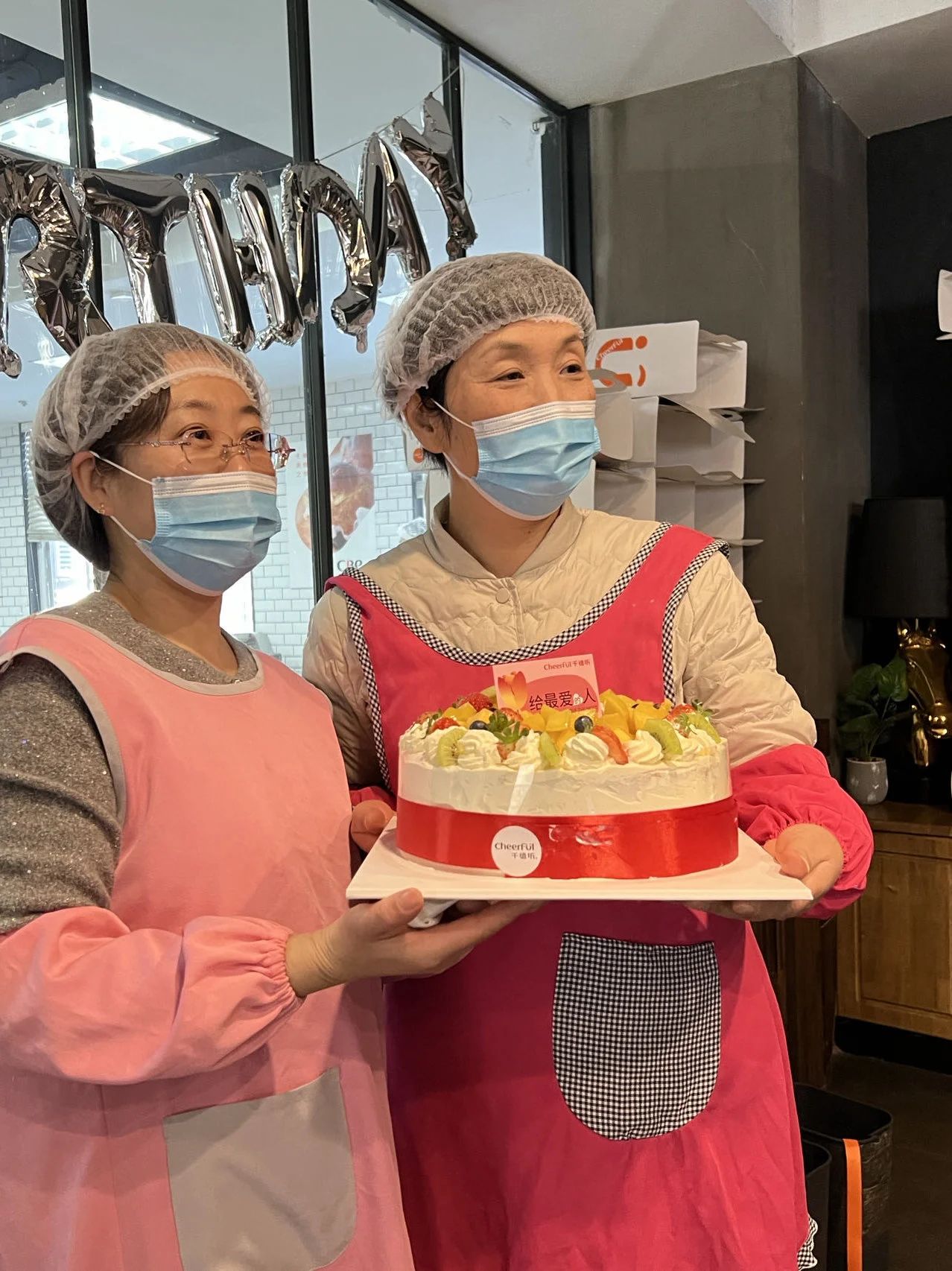 她们对自己的蛋糕成品赋予了独特的设计,有的以美丽为主题,以花瓣作装饰;有的以可爱为主题,以玩偶作点缀。大家平日里忙碌的心情在这一刻得到了放松,你指导我用转盘,我指导你涂奶油,活动现场充满了欢声笑语。