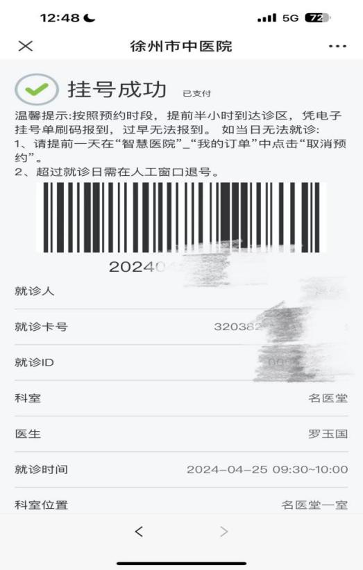 4、预约成功后,就诊当天请根据预约就诊时间段提前30分钟到院即可,微信公众号直接刷手机挂号信息的条形码即可;江苏医保云刷就诊码报到;电话预约需要去人工挂号收费处取号。