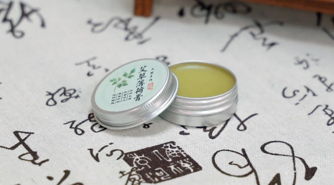 制作:鲜艾叶、鲜薄荷清洗、沥干水分。将艾叶、薄荷剪碎后,加入等量橄榄油,隔水加热1h,趁热过滤、挤压出油。萃取油中加入适量蜂蜡,隔水加热至蜂蜡完全融化。待降温至50°C以下时,加入冰片,搅拌至溶解。趁热灌装,冷凝后即可使用。