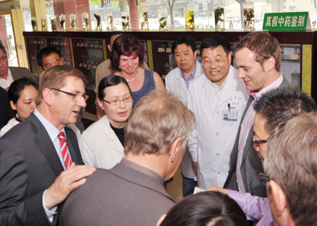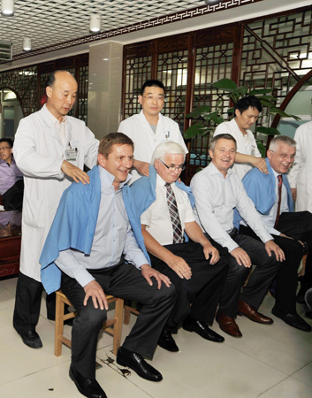 王培安院长首先向外宾介绍了医院概况及发展情况,双方进行了亲切的交流座谈并互赠了纪念品,在院领导的陪同下,来宾们饶有兴趣地参观了神农堂、名医馆、中医综合治疗区并亲身体验中医传统推拿按摩。
