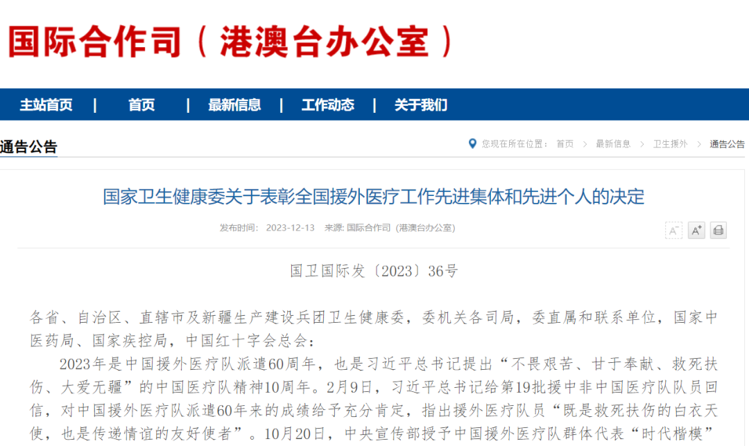 近日,国家卫生健康委发布“关于表彰全国援外医疗工作先进集体和先进个人的决定”。为弘扬中国医疗队精神,表彰先进,树立典型,经中央批准,国家卫生健康委决定,授予第2...